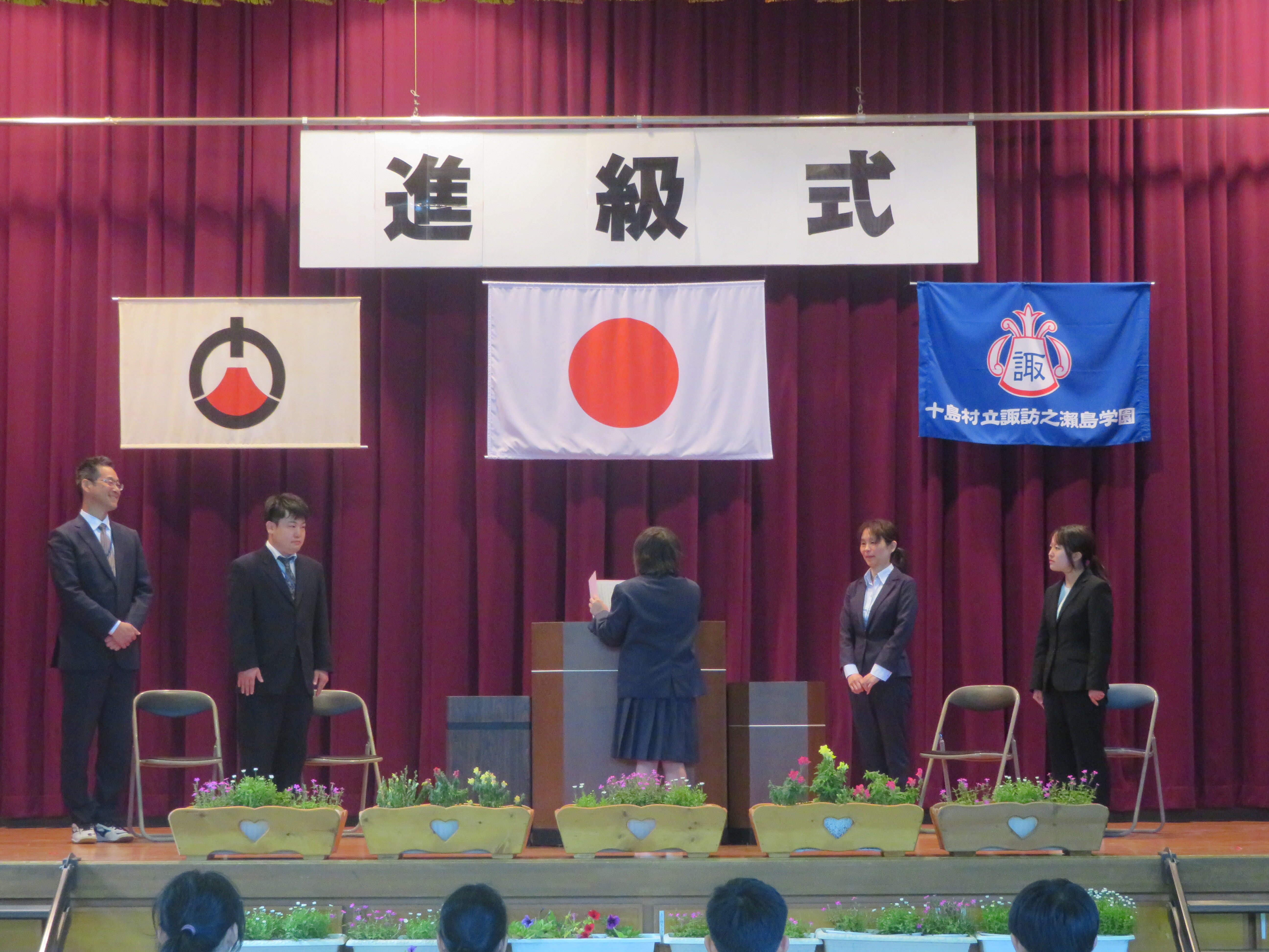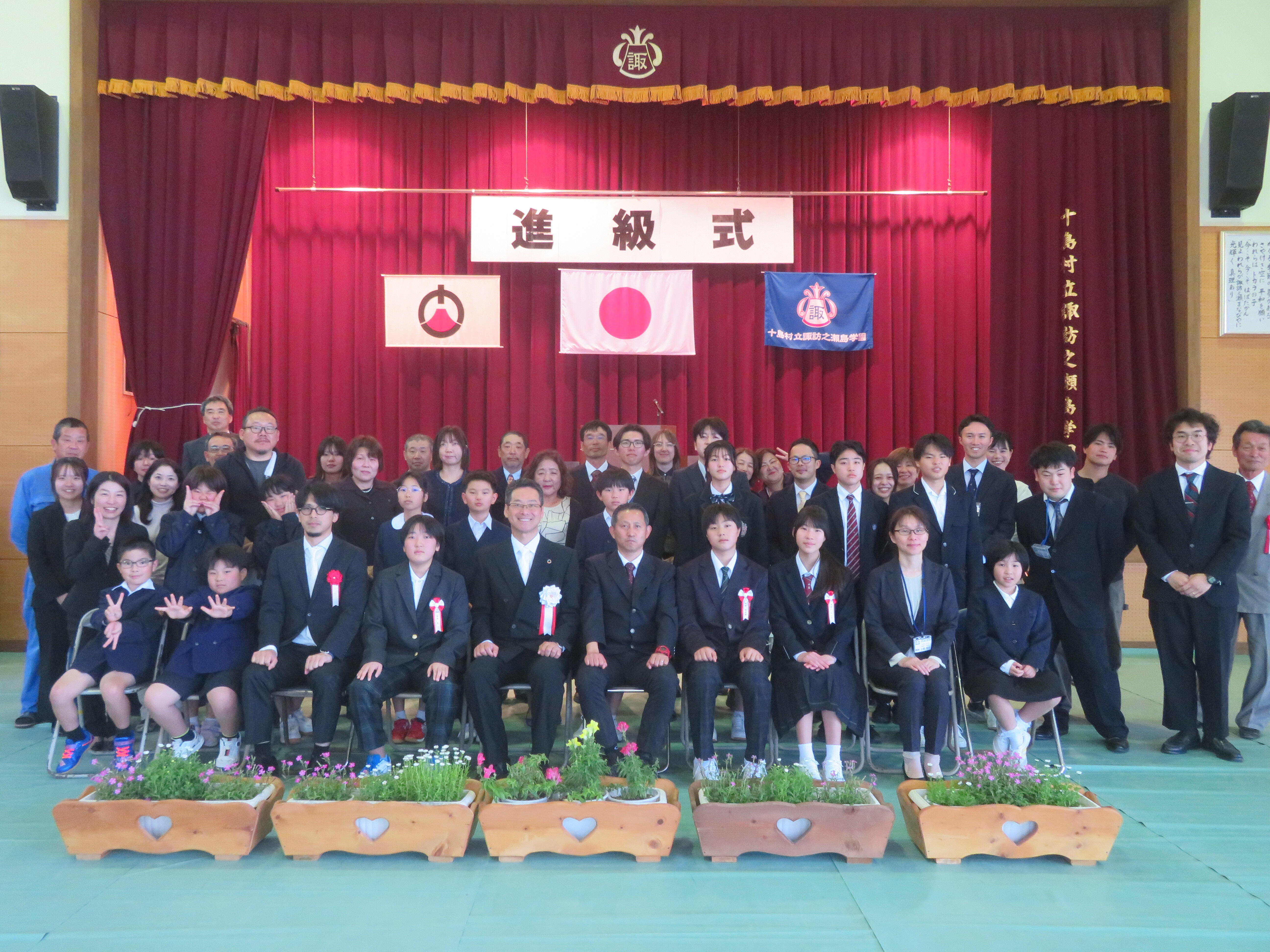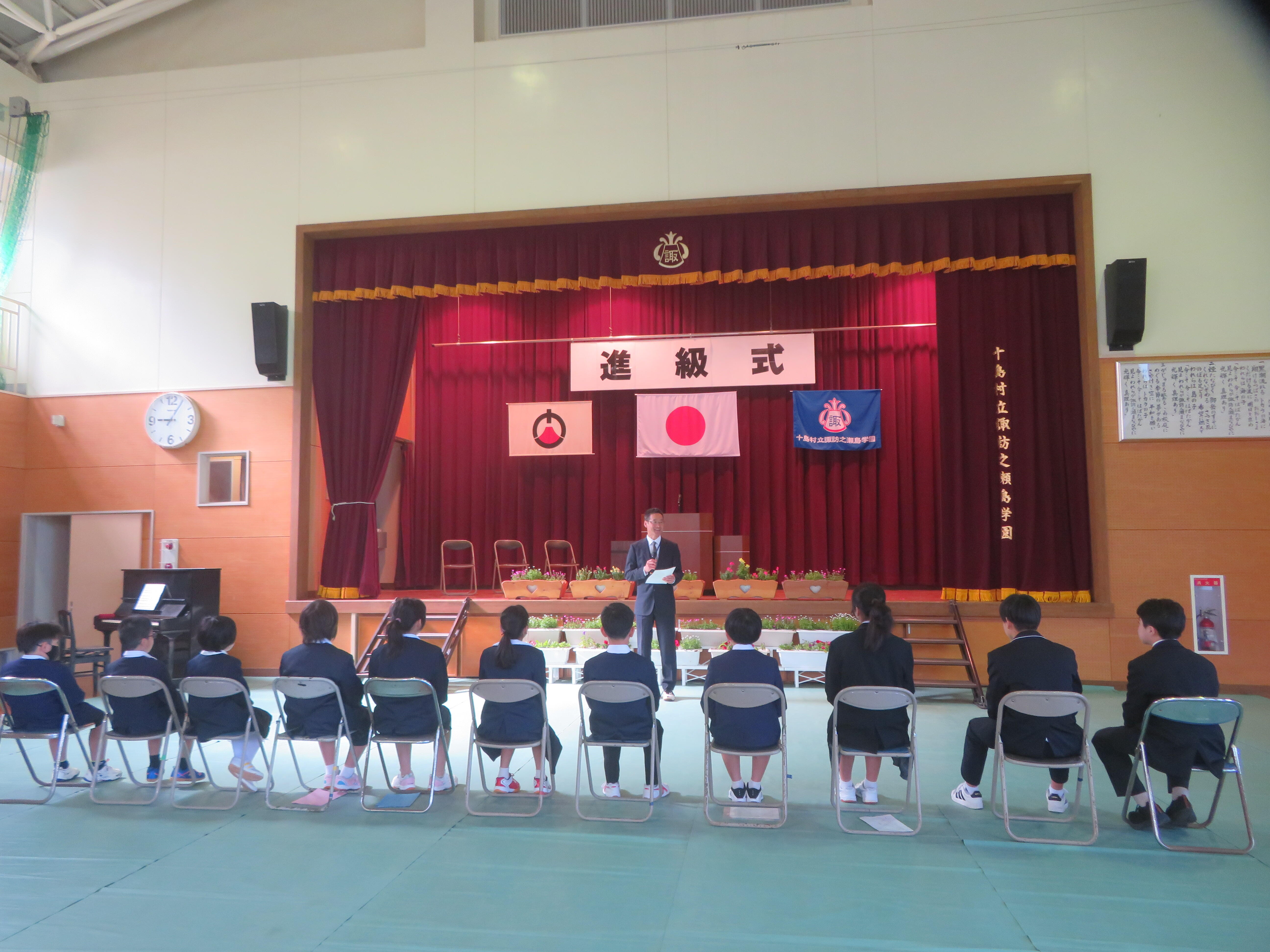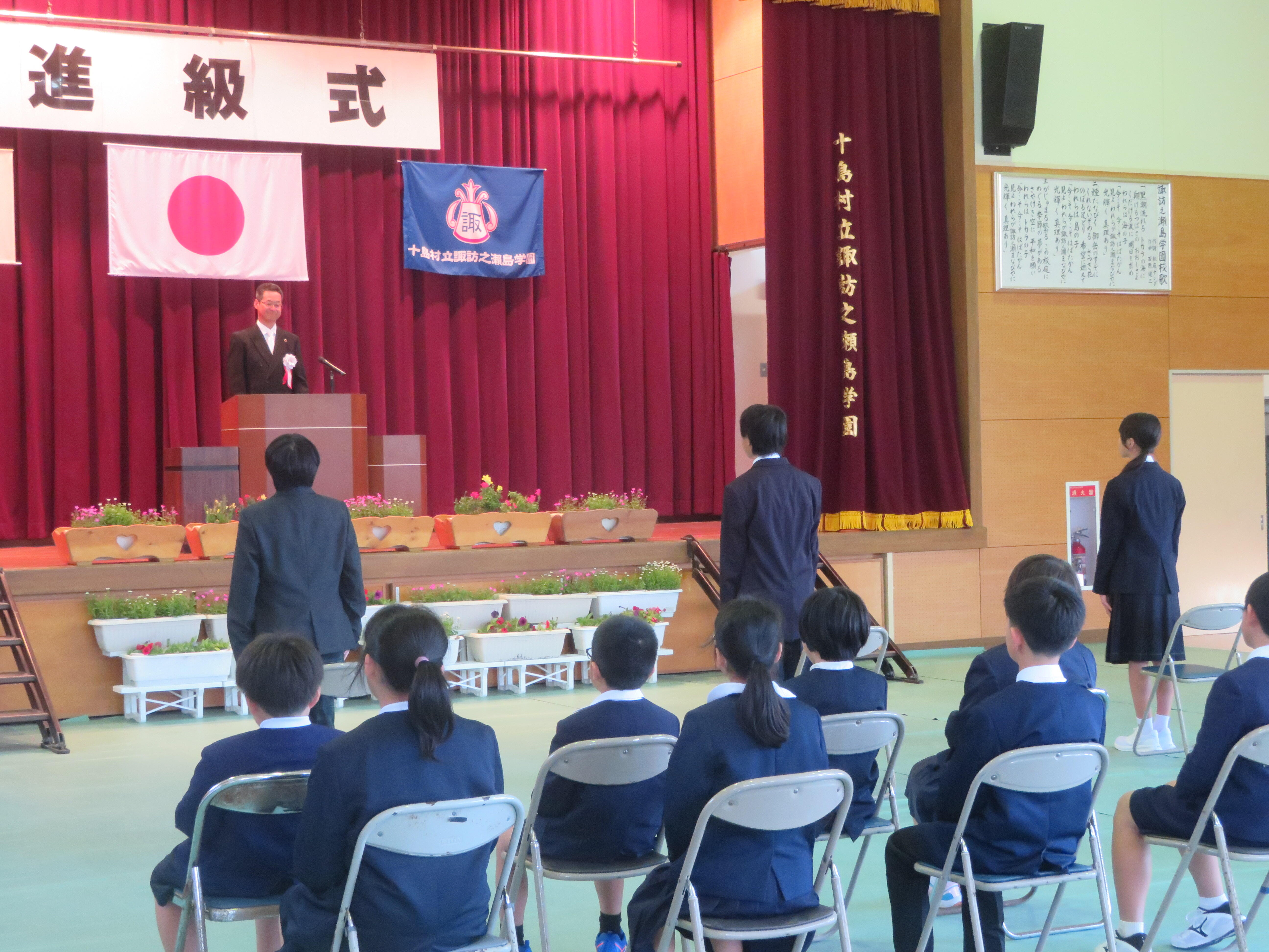 午後からの後期課程進級式には、島民の方々もたくさん来てくださり、後期課程3人が進級しました。進級生紹介では、少し緊張しながらも「よろしくお願いします。」と元気よく挨拶をすることができた子どもたちに温かい拍手が送られました。今年は後期課程9年生に山海留学生2人が新たなメンバーとなり,総勢15人の児童生徒で賑やかな学校生活が始まりました。これから、いろいろな行事等を通して成長していく子どもたちの様子をお伝えしていきたいと思います。